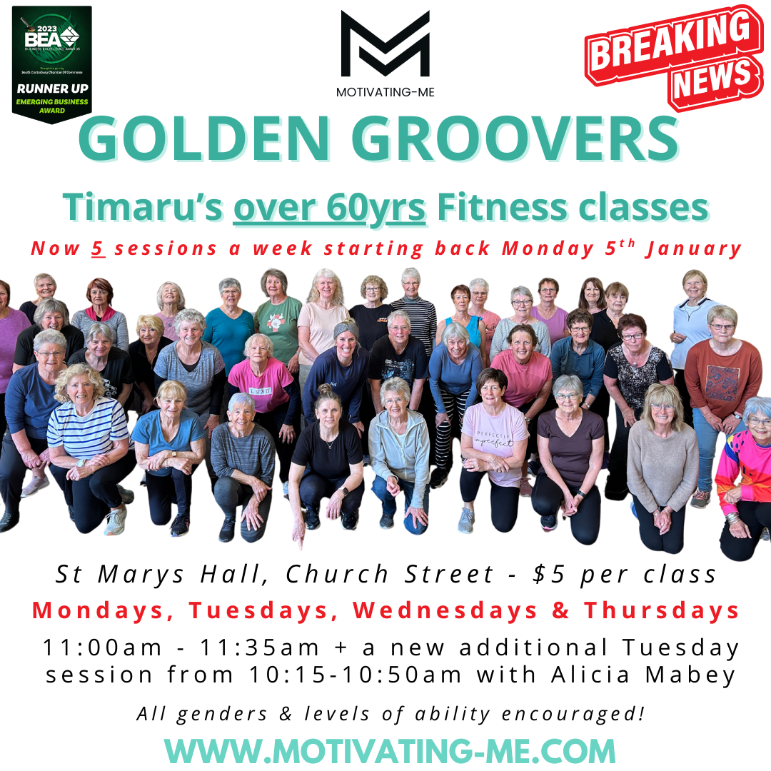 As we age our bone density decreases and balance goes out the window which is why I developed GOLDEN GROOVERS, a 35min class run every Monday, Tuesday, Wednesday & Thursday at 11am plus a new additional earlier session on a Tuesday from 10:15-10:50am in Timaru’s St Mary’s Hall on Church. Just as important as moving our body is to have a connection and a laugh with others, which is why it has grown into the community it is today. For those keen, we go for a coffee after class and also have bi-annual Dinners together. Classes are $5 per session and no booking required!